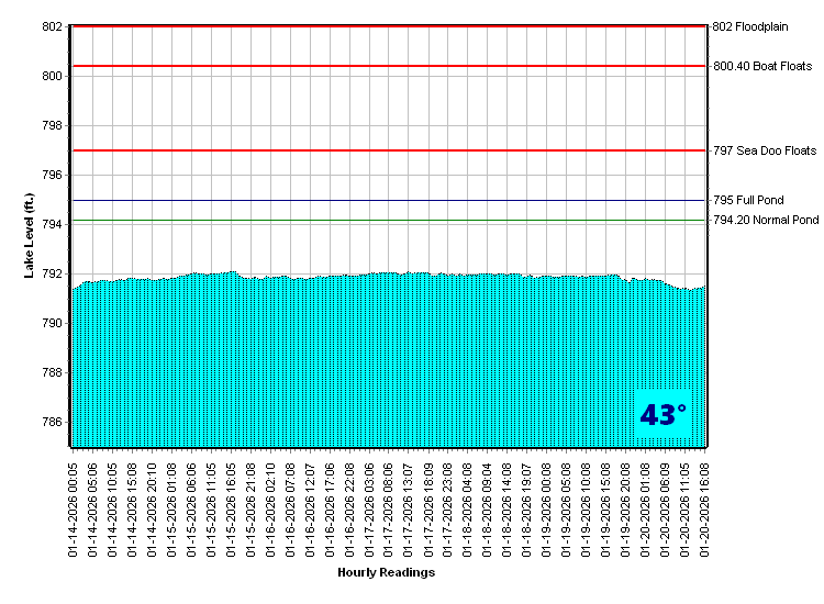 Current level is 791.52 feet and rising (at a rate of 0.06 feet/hour).