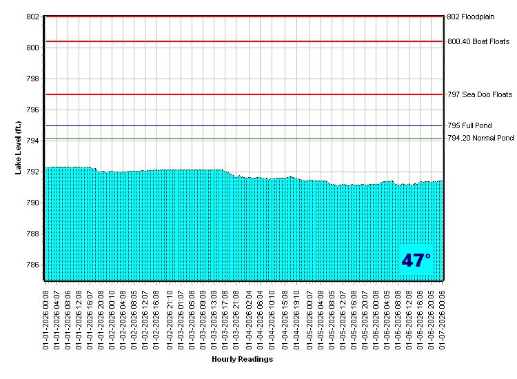 Current level is 791.43 feet and rising (at a rate of 0.01 feet/hour).