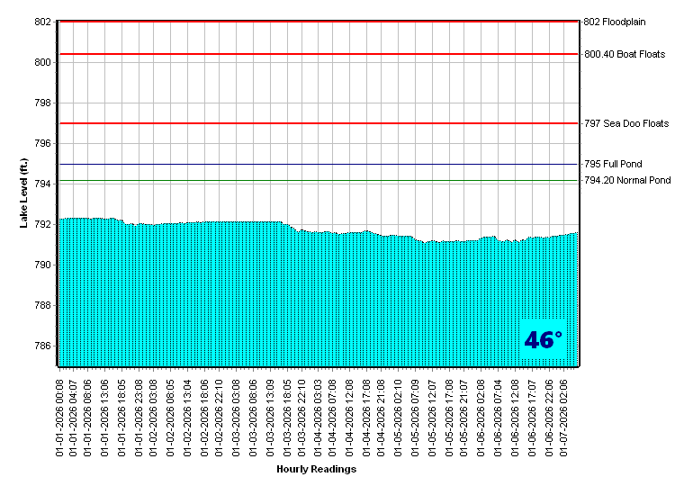 Current level is 791.64 feet and rising (at a rate of 0.05 feet/hour).
