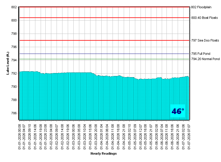 Current level is 791.43 feet and falling (at a rate of 0.21 feet/hour).